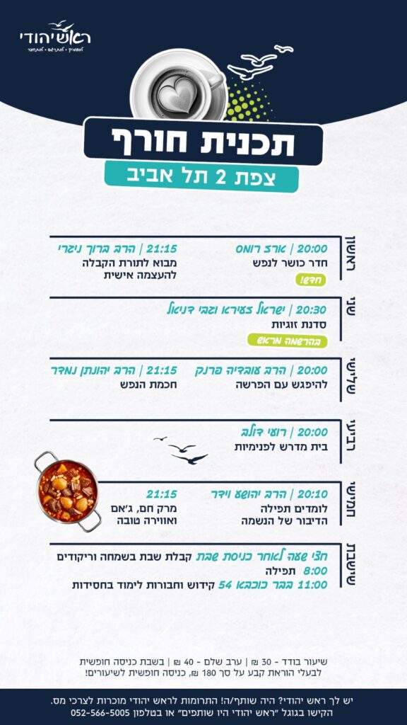 מרכז למודעות עצמית בלב תל אביב, המעניק תוכן, השראה וחוויה לחבר'ה שבא להם להעמיק, ללמוד ולהעז לשאול שאלות מהותיות ומרתקות. ומה תכלס? מענה לצימאון הגובר והולך לזהות היהודית שלנו.